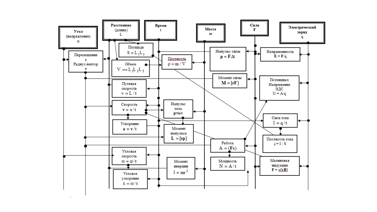 Итак: базовые величины: расстояние, промежуток времени, сила; угол, масса, электрический заряд.